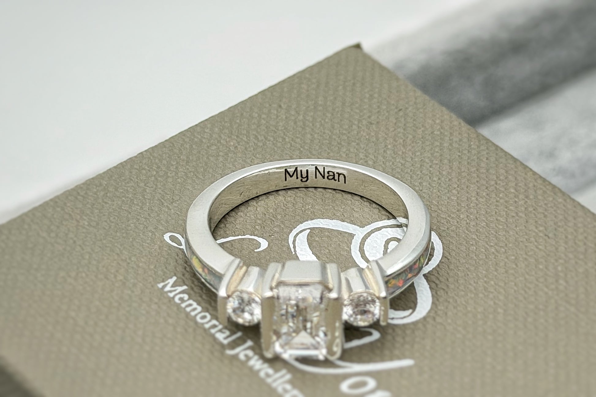 We use a high powered infrared laser engraving machine to engrave our jewellery. It leaves a ‘patina’, which makes the engraving appear darker. This colour will slightly fade through normal wear and polishing.