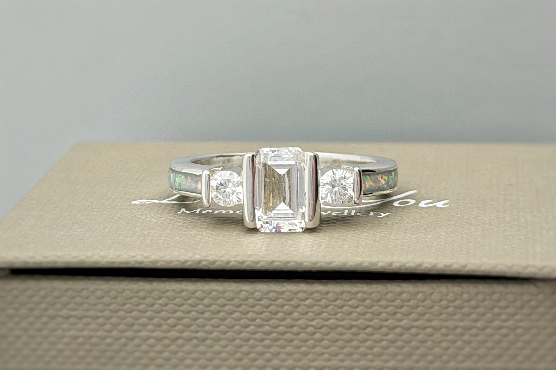 Made from 925 sterling silver with a high quality emerald cut cubic zirconia stone centre and round cubic zirconia side stones