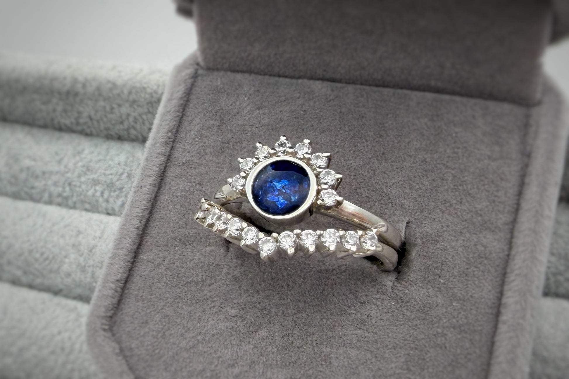 Made from 925 sterling silver with high quality cubic zirconia stones forming a half halo on the bottom half of the round stone