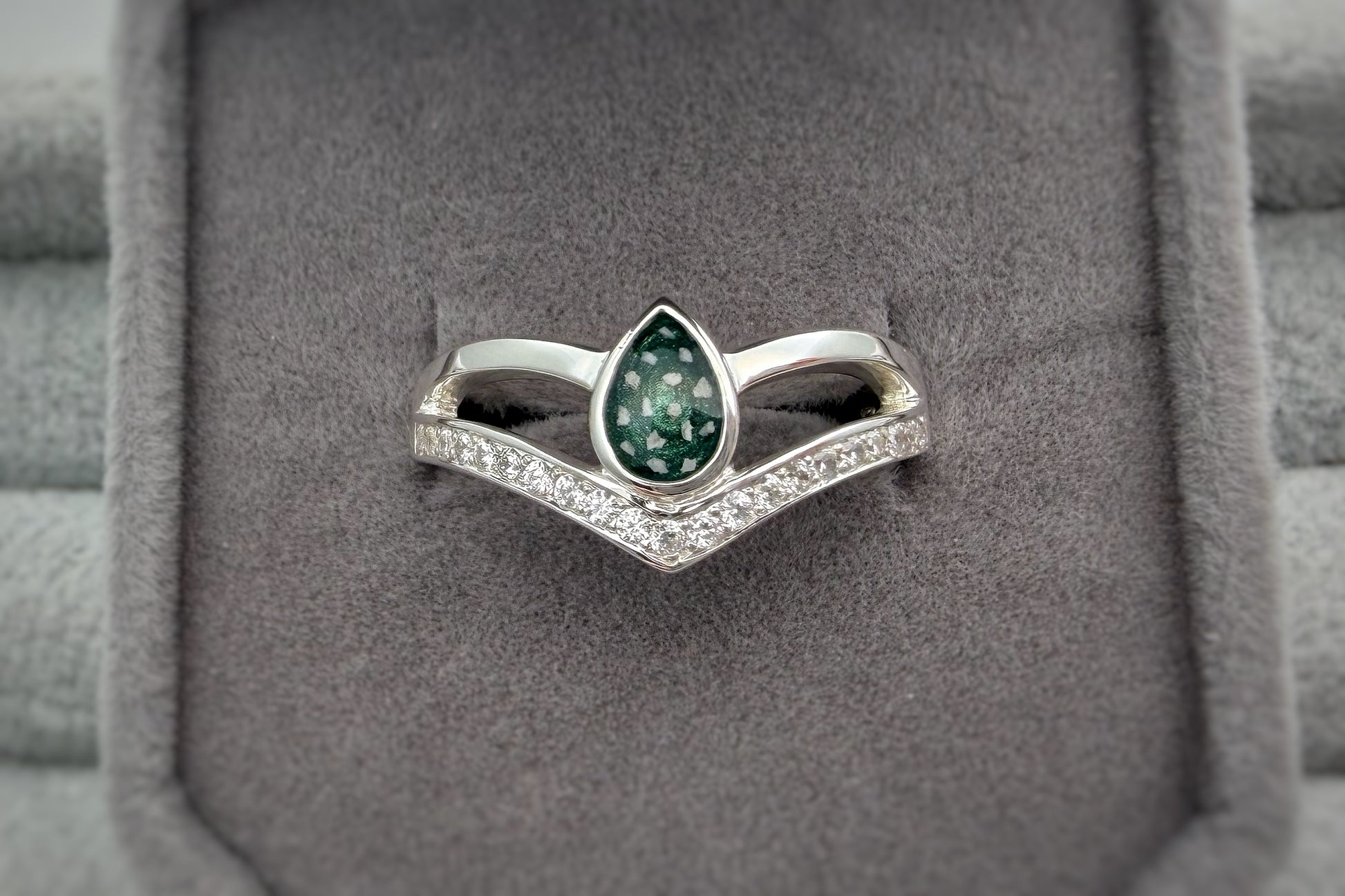 Made from 925 sterling silver with a pear shaped memorial stone and crystal wishbone underband.