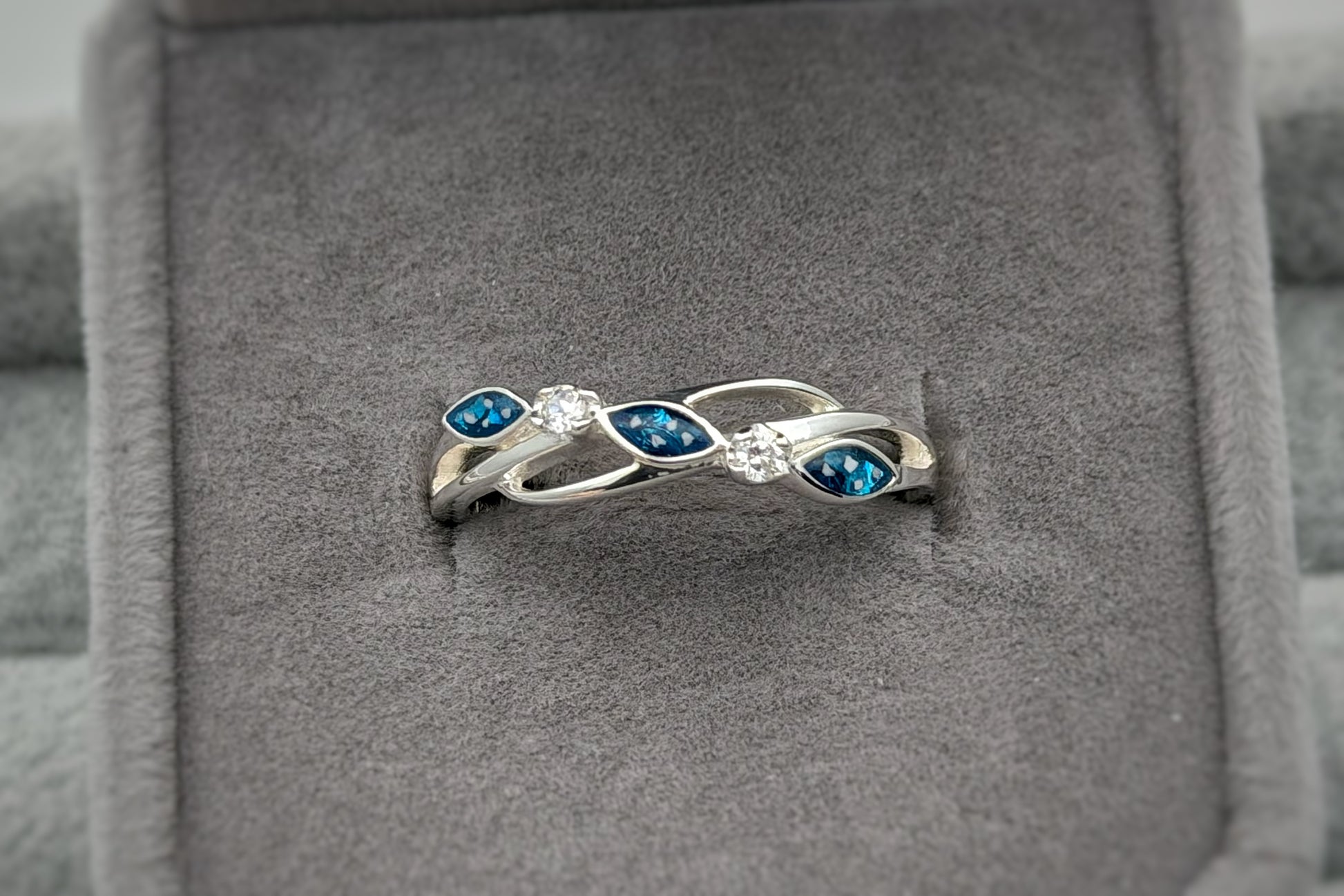 Made from 925 sterling silver it features three marquise shaped stones separated by 2 clear crystals.