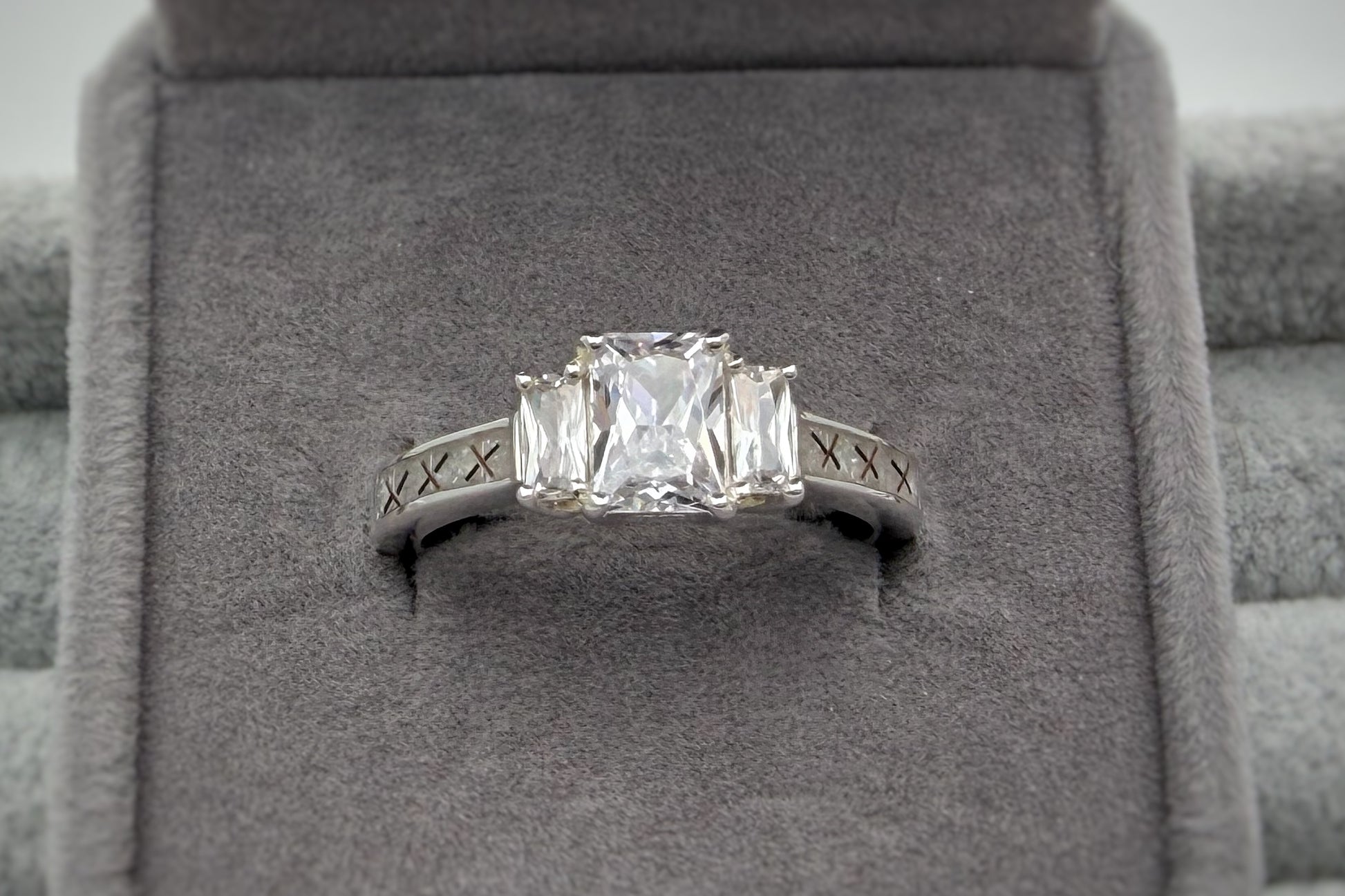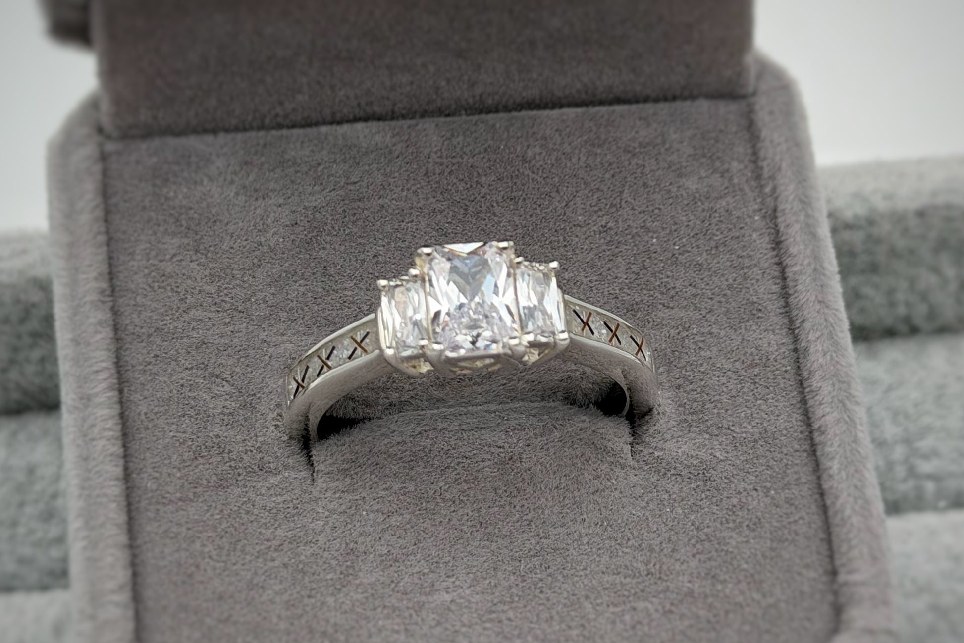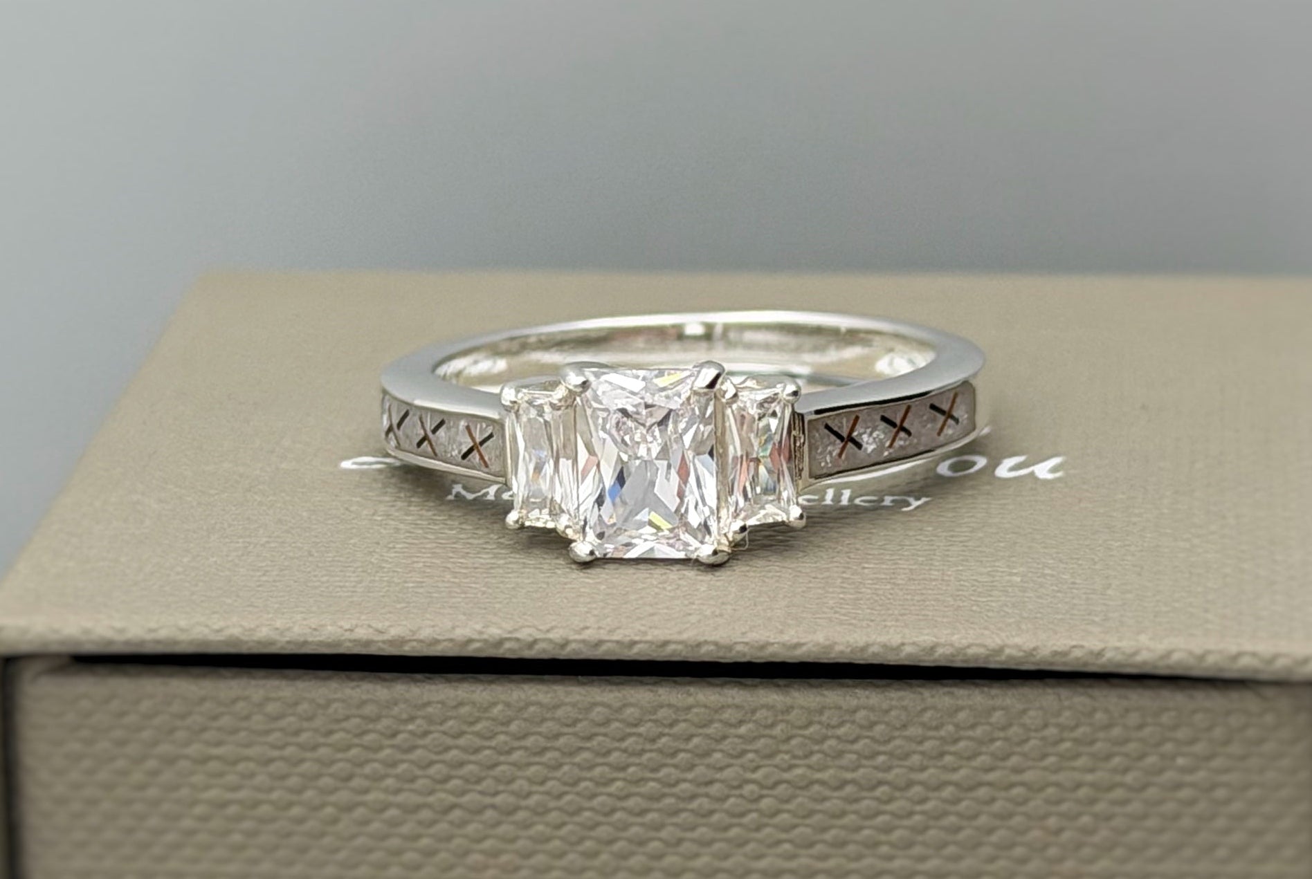 Made from 925 sterling silver with a trio of high quality cubic zirconia emerald cut stones