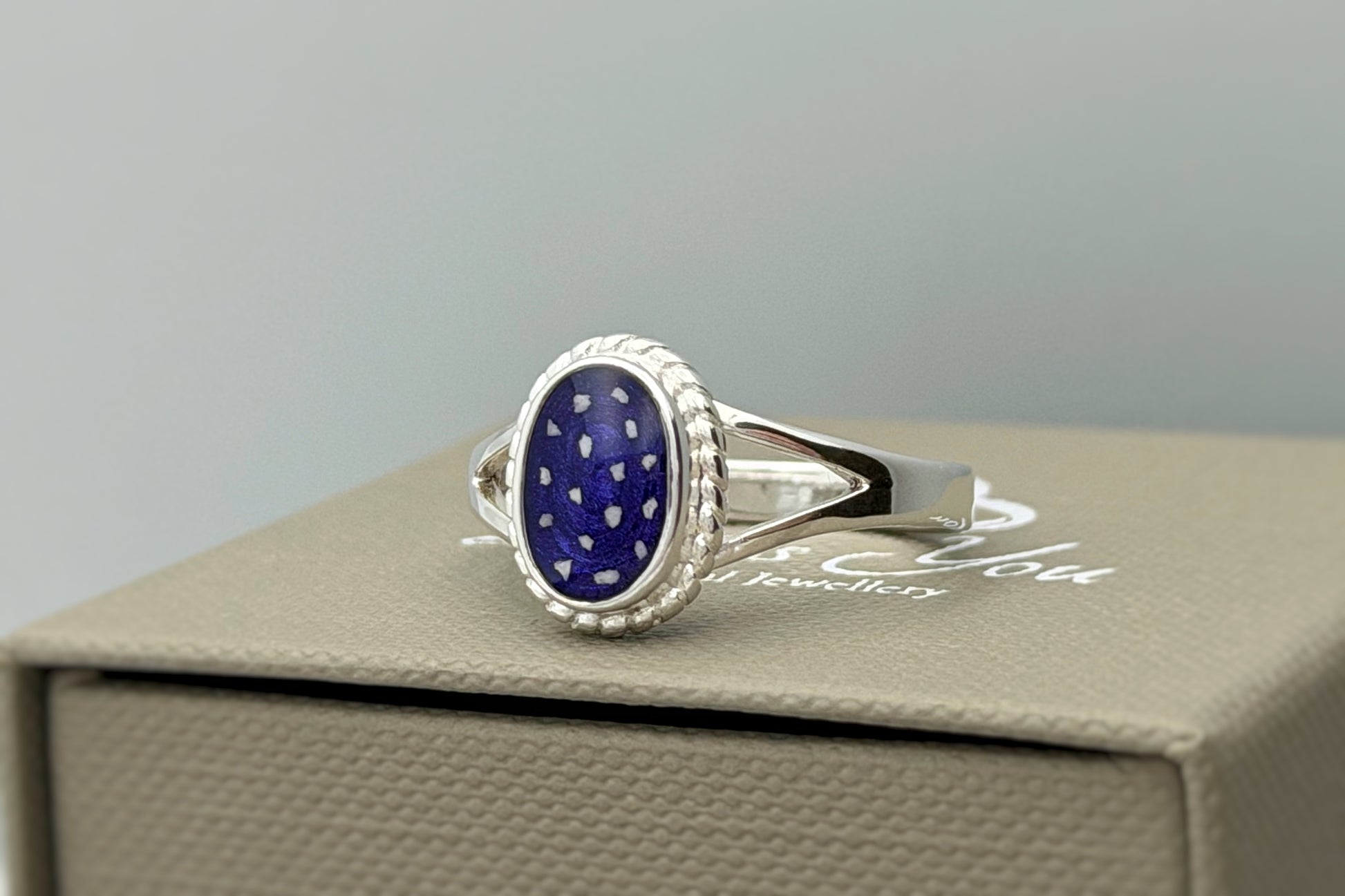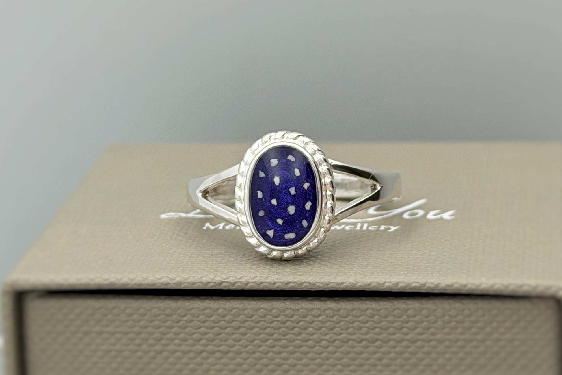 We use a high powered infrared laser engraving machine to engrave our jewellery. It leaves a ‘patina’, which makes the engraving appear darker. This colour will slightly fade through normal wear and polishing.